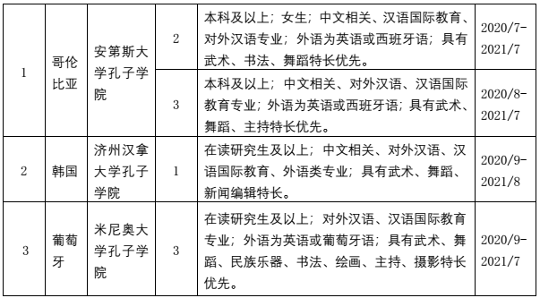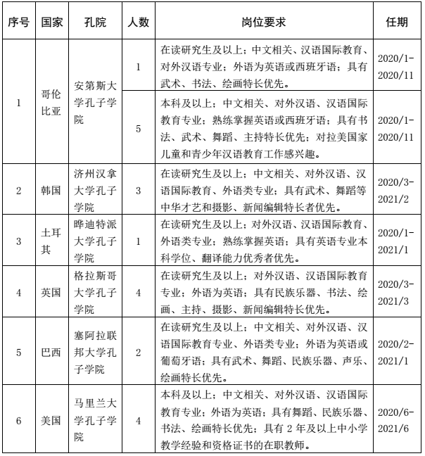 2020年全年新选志愿者5522人,其中优先面向中方合作院校招募孔子学院志愿者2850人,面向全国各类学校招募普通项目志愿者2672人。岗位需求详见附件,此次报名面向2020年上半年岗位。其中,我校合作建设孔子学院2020年上半年岗位需求如下:
