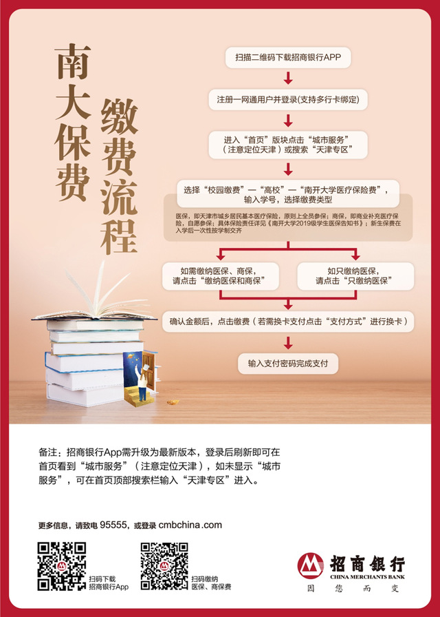2019年学生保险费(医保和商保)通过招商银行APP进行缴纳(支持交通银行、招商银行等多家银行卡绑定),缴费时间2019年10月28日至2019年11月15日。具体流程如下: