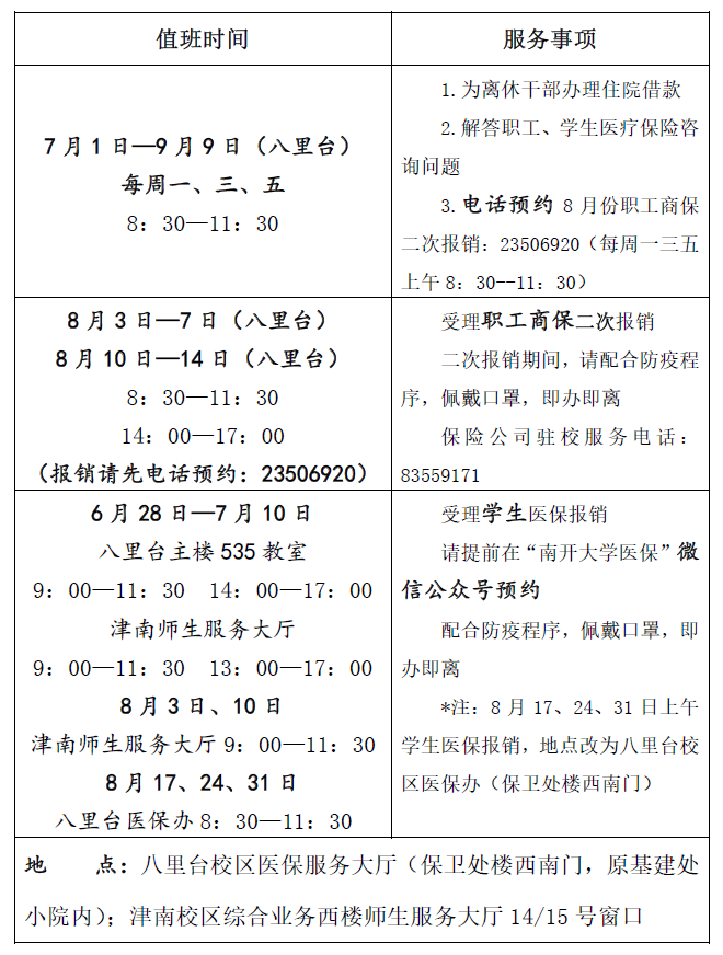 2020年暑假期间,医保办继续为职工和毕业年级学生提供医疗保险报销和咨询等相关服务。具体安排: