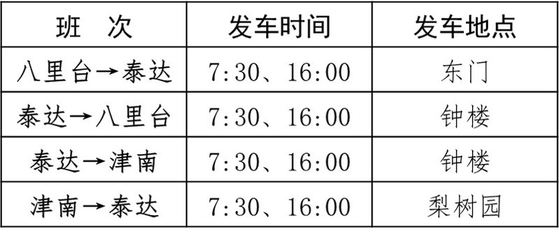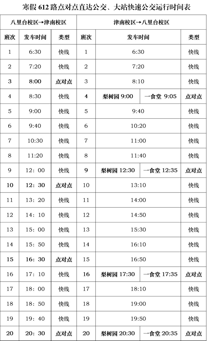 泰达校区与八里台、津南校区通勤班车自2021年1月23日至2月20日按照假期班车方案运行,周六、周日及2月11日(除夕)到2月17日(正月初六)暂停运行。具体班次安排为:
