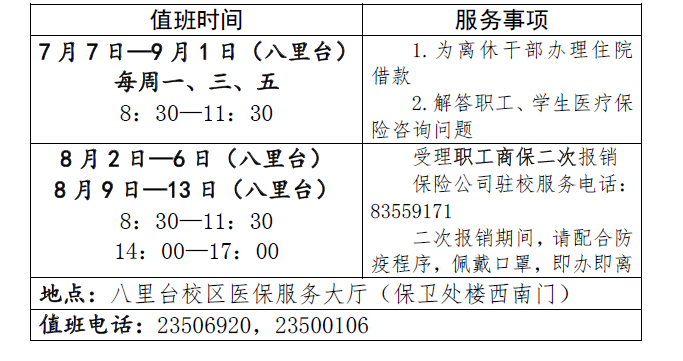 2021年暑假期间,医保办继续为师生提供医疗保险咨询等相关服务。具体安排: