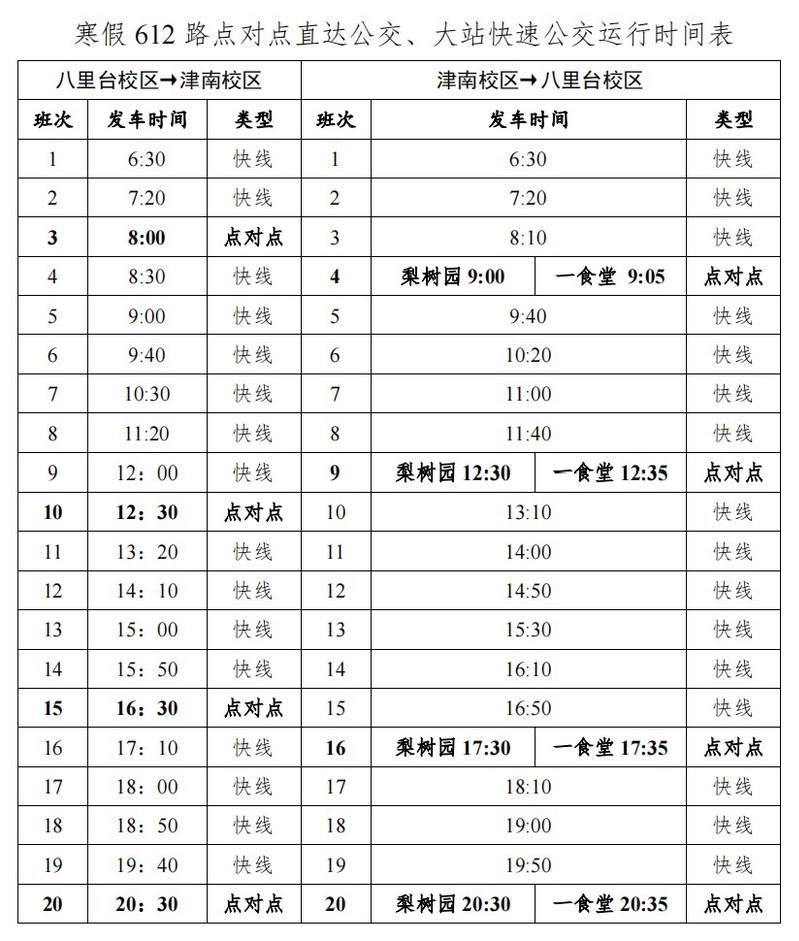 1月17日(周三)至2月17日(周六),泰达与八里台、津南校区班车按照假期班车方案运行,2月18日(周日)恢复正常工作日运行。如遇临时调整,另行通知。